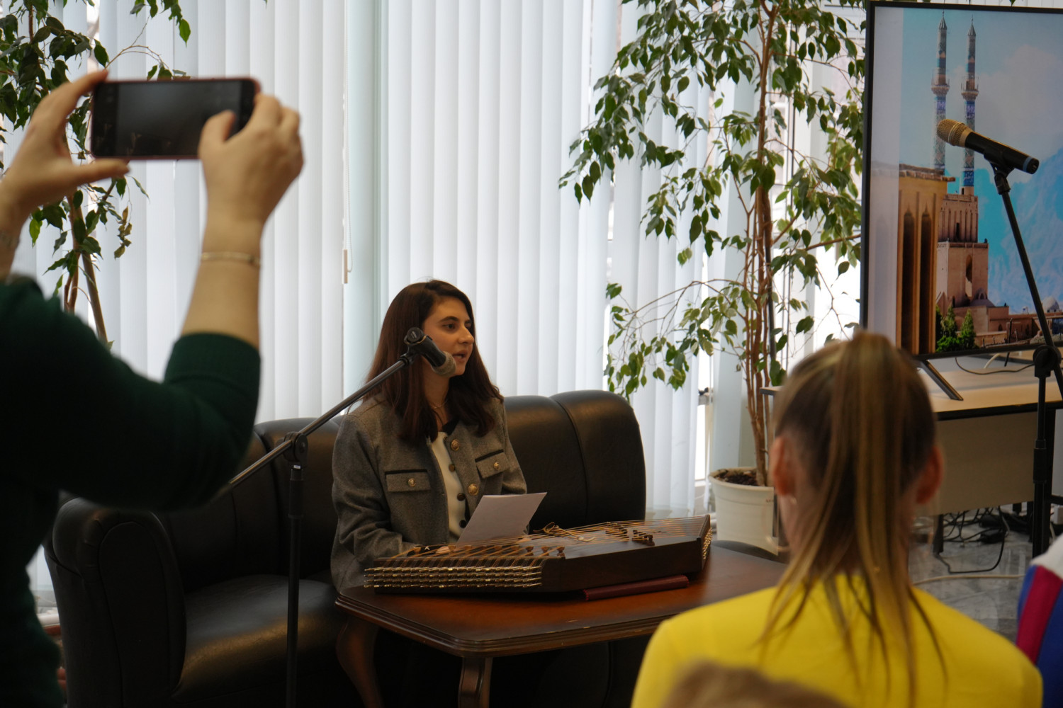 Открыла нашу встречу чарующая магия восточной поэзии. Учащаяся подготовительных курсов русского языка из Ирана Бейги Рейханехсадат исполнила знаменитые строки поэта Сохраба Сеперхри на изысканном персидском языке (фарси), сопровождающиеся волшебным звуком древней сантуры — традиционного иранского музыкального инструмента. Также Рейханехсадат прочла стихотворение А.С. Пушкина «Я вас любил».