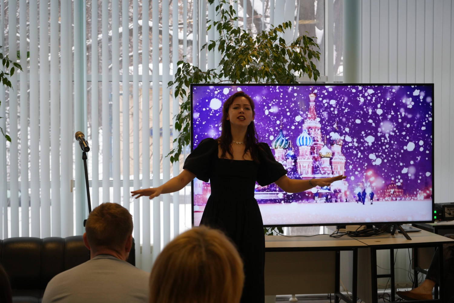 С песней французской певицы ZAZ «Je Veux» выступила начальник отдела развития карьеры и содействия трудоустройству выпускников Черепанова Вероника Игоревна под гитарное сопровождение студента 1 курса «РиСОТ» — Рыбакова Михаила.