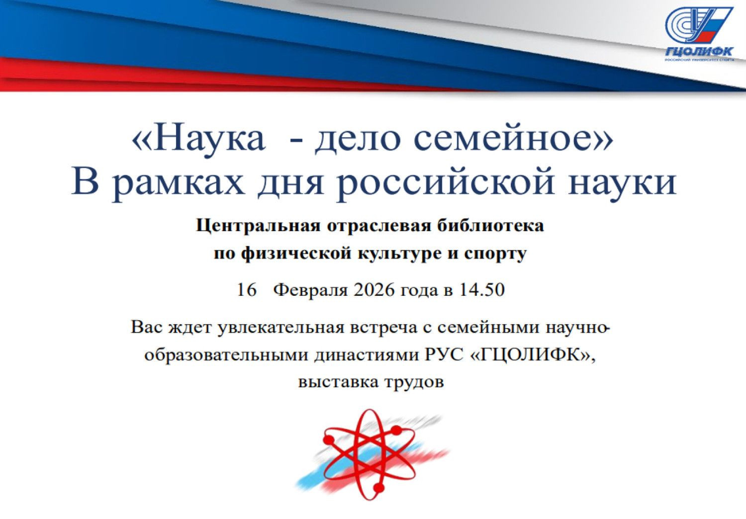 Ко Дню российской науки в Центральной отраслевой библиотеке по физической культуре и спорту в рамках Недели российской науки, состоится встреча с семейными научно-образовательными династиями Российского университета спорта «ГЦОЛИФК».