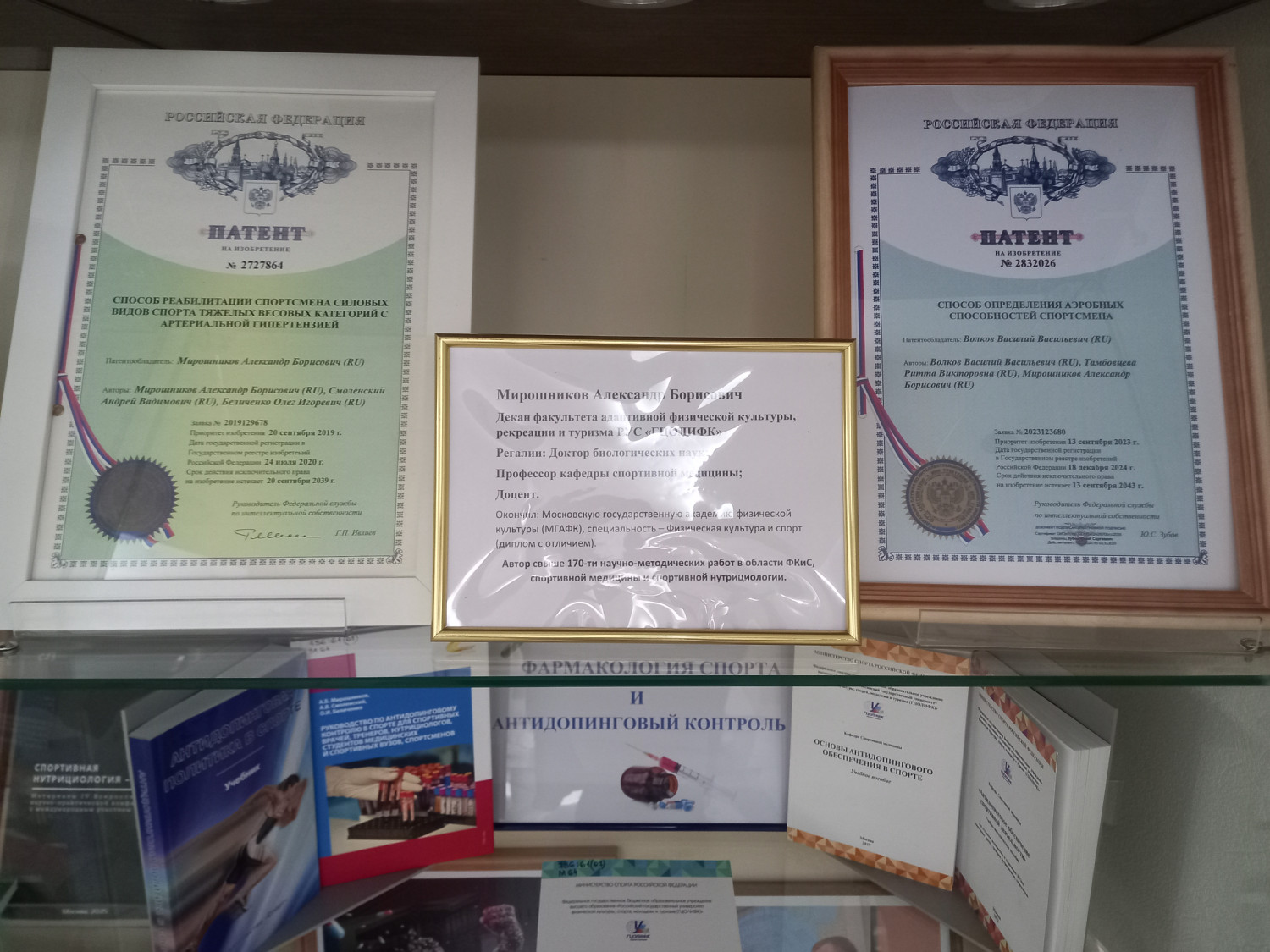 Александр Борисович Мирошников - автор свыше 300 научно-методических работ в области ФКиС, спортивной медицины и спортивной нутрициологии. Является членом международных ассоциаций: ISSA (International Sports Sciences Association); EFR (Emergency First Response); AHA (American Heart Association); член междисциплинарного научного общества профилактики и лечения ожирения. Имеет дипломы и сертификаты международного уровня, ряд наград. Неоднократный победитель в научных конкурсах, имеются патенты и изобретения, которые частично представлены на выставке.